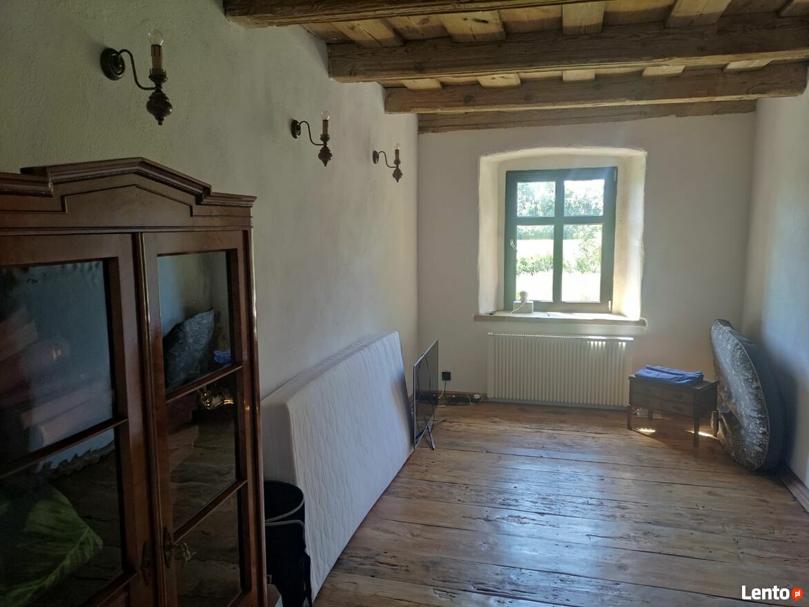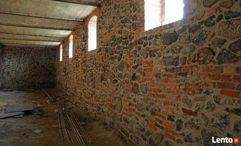 3/W części dużej sali ( zaadoptowana stodoła) , na parterze jedno duże pomieszczenie ( sala), wykonane oświetlenie i instalacja elektryczna. Pozostało do ułożenia podłoga z cegły oraz stolarka drzwiowa. Na dole znajduje się pomieszczenie przystosowane na małą toaletę.