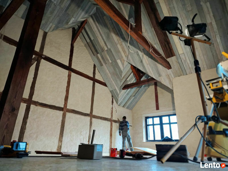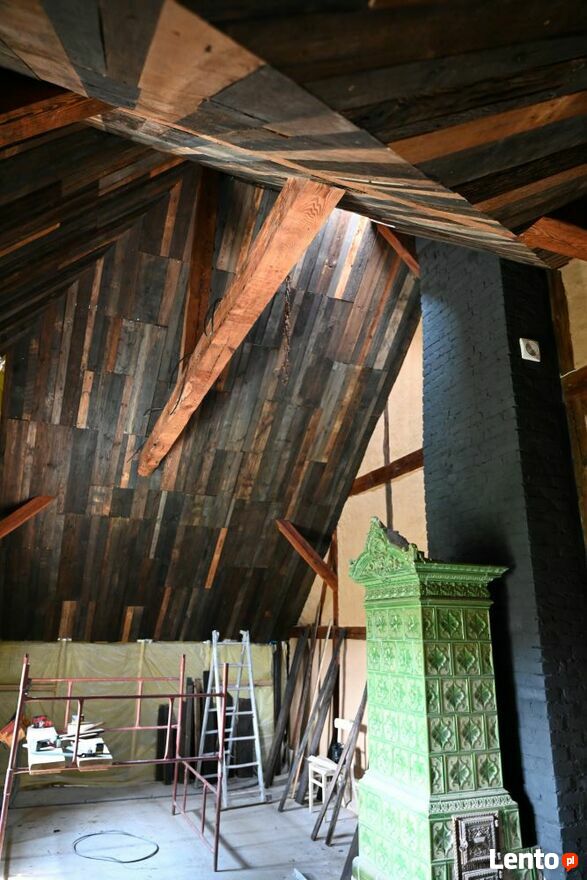 Na poddaszu ( nad salą) znajduje się jedno duże pomieszczenie wysokość do kalenicy około 5 metrów. Pomieszczenie w całości ocieplone ( wełna) do skończenia podbitka oraz ułożenie podłogi z desek. ( deski na podłogę są zakupione -jesion ręcznie heblowany gr desek 2,5 cm z masywu jesionowego).